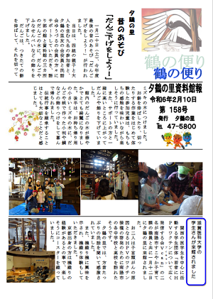 今月号は、1月20日に行われた昔のあそび「だんご下げをしよう」の記事や、 2月6日から開催されております企画展「夕鶴のひな飾り展」の見どころなども 掲載しております。