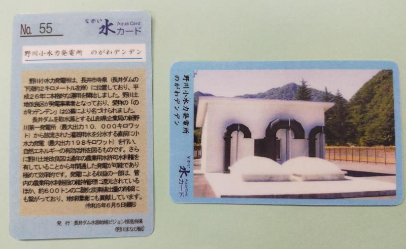 NO55は、「野川小水力発電所 野川デンデン」です。野川まなび館を利用した方、展示室を見学した方への記念品として無料で配布しています。ご希望の方は、事務所までお声がけください。※発行年度内は無料で配布しています。次年度からは50円の協力金を頂いています。※郵送による配布は受け付けておりませんのでご了承ください。発行 長井ダム水源地域ビジョン推進会議