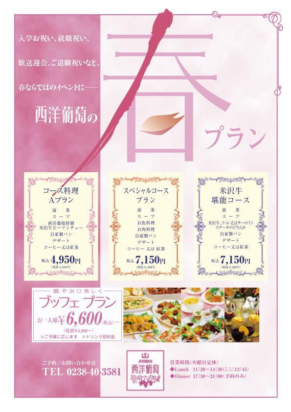 西洋葡萄の 春プラン入学お祝い、就職祝い歓送迎会 ご退職祝いなど春ならではのイベントに___ *コース料理 Aプラン ¥4,950(税込) 前菜、スープ 西洋葡萄特製米沢牛ビーフシチュー 自家製パン デザート コーヒーor 紅茶 *スペシャルコース ¥7,150(税込) 前菜、スープ お魚料理 お肉料理 自家製パン デザート コーヒー or 紅茶 *米沢牛堪能コース ¥7,150(税込) 前菜、スープ 米沢牛フィレ又はサーロインステーキのどちらか 自家製パン デザート コーヒー or 紅茶 -----賑やか楽しく------*ブッフェプラン お一人様 ¥6,600(税込)〜 ・ご予算に応じます。ご相談ください。 ・ドリンク別料金 ご予約/ お問い合わせは TEL 0238-40-3581西洋葡萄 営業時間 ( 火曜日定休 )◆ Lunch 11:30~14:30 (ラストオーダー13:45)◆ Dinner 17:30~21:00 (予約のみ)
