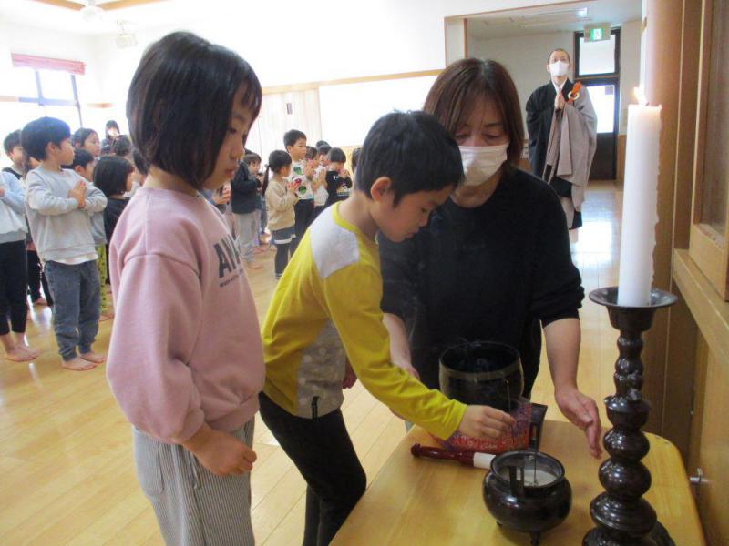 涅槃会では関興庵の窪副住職様よりお経を読んでいただき、子ども達は静かに心落ちつかせて法要に参加していました。法要の後はとても立派な涅槃図を見せていただきました。図鑑にもない動物や鬼なども描かれており、食い入るように興味津々で見ていました。子どもたちからは「空に白い丸と黒い丸があるのはなに?」(月も悲しんで黒くなった)「なんでお釈迦様は金色なの?」(偉い人だと分かるように大きく金色に描いている)などの質問がたくさん出ていました。