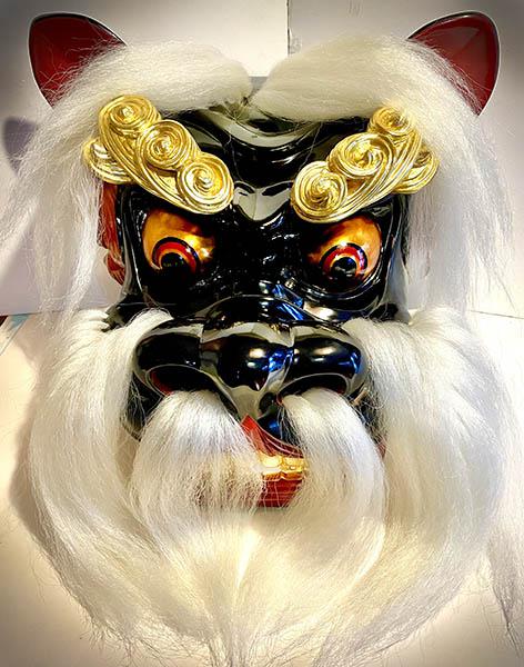 タテガミを取り付ける前と後では、獅子頭が随分大きく見える。白い前髪のタテガミから覗く鋭い眼光