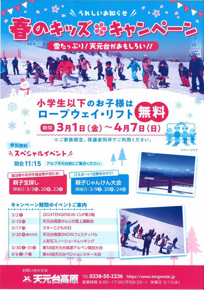 【春のキッズキャンペーン】小学生以下は乗車券が無料に! 春のスキーシーズンは、親子で楽しみましょう!!キャンペーン期間中、小学生以下のお子様はロープウェイ・リフトが無料!この機会にぜひお越しください! ◇開催期間 3月1日(金)〜4月7日(日)※保護者同伴でお越しください。お申し込みは不要です。 ◇スペシャルイベント 参加無料!@宿泊券や米沢牛商品券が当たる!親子宝探し!開催日:3月3日(日)・20日(水・祝)・23日(土)開 会 11:15場 所 アルブ天元台前 Aパスポート1日券をかけて!親子じゃんけん大会!開催日:3月9日(土)・20日(水・祝)・24日(日)開 会 11:15場 所 アルブ天元台前 ◇お問い合わせ 天元台高原 0238-55-2236