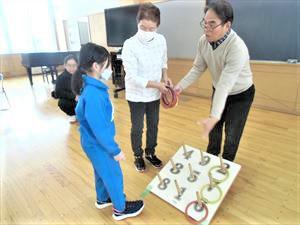 致芳コミュニティセンターで行っている輪投げクラブを今日は学校に来て開催し、子供たちと一緒に楽しんでいただきました。ルールやコツを伝授していただき、早速練習です。9つある番号のタテ・ヨコ・ナナメに輪が入って揃うとボーナス30点、それに入った番号の得点を合計するというのが今回のルールでした。簡単そうで難しい、そして誰でも競技できるのが輪投げの奥深さです。子供たちは思ったよりもうまく入らないことが楽しさにつながっていたようです。だからこそ入った時はみんなで喜び、そろった時には歓声が上がっていました。「学校施設を開放し、日常的に交流して、一緒に楽しむ」コミュニティ・スクールからスクールコミュニティの第一歩です。一緒に楽しんでいただいた、平さん、今野さんありがとうございました。