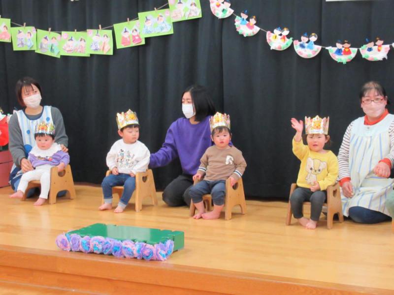 3月2日(金)に3月の誕生会&ひなまつりがありました。ステージには7段飾りのおひな様が凛々しく並び、その周りを各クラスが製作したおひな様が彩りを添えてくれています。3月の誕生児は6名。誕生児の得意なことの発表では、かわいらしい姿や得意気な姿を見せてくれました。お楽しみはひなまつりにちなんだ『ひなまつり〇×クイズ』。子どもたちはクイズを楽しみながら、ひなまつりの由来や意味など日本の伝統行事に触れました。