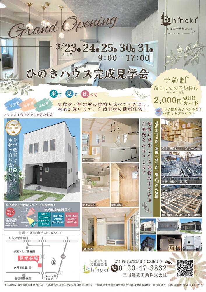 早春の候 皆様におかれましては、益々ご清祥の事とお喜び申し上げます。さて、この度、南陽市椚塚に完成しましたモデルハウスの完成見学会を開催いたします。各部屋がゆったりとした間取り、駐車スペースも4台、おしゃれな建物となっております。ぜひ、この機会に当社の健康住宅をご体感下さい。 ●日 時:3月23日(土), 24日(日), 25日(月), 30日(土) , 31日(日) 9:00〜17:00 ※完全予約制となりますので、予めご連絡お願いいたします。 前日までの予約特典 2,000円分のQUOカード ( はじめての方限定 ) ●会 場:南陽市椚塚1623−4 ●来場者得点:お子様プレゼント(お菓子のつかみ取り) お楽しみプレゼント ●ご連絡先 :0120−47−3832 三浦建設工業スタッフ一同、皆様のお越しを心よりお待ちしております。