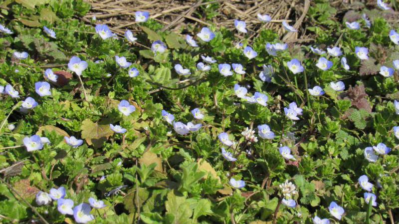●一面にオオイヌノフグリが咲いています 水色の可愛らしい小さな花ですが名前の由来も変わっています こんなに可愛らしい花ですが犬のフグリ(陰嚢)ににているので付いた名前だそうですがどこが似てるのでしょうか 夜の冷え込みは厳しく、温度差の激しい環境を堪え忍ぶ仕組みを持っているのであろうと思われます 早春から咲いている雑草でいたるところに咲いている可愛らしい花です