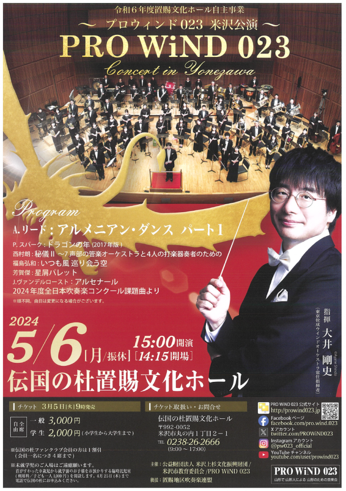 伝国の杜置賜文化ホールにて「PRO WiND 023米沢公演」が開催されます。大井剛史氏の指揮のもと、様々な楽曲が披露されます。この機会にぜひ、ご来場ください。<日時>令和6年5月6日(月・祝)15:00開演(14:15開場)<場所>伝国の杜置賜文化ホール<入場料>一般:3,000円学生:2,000円(小学生〜大学生)<問い合わせ>伝国の杜置賜文化ホール 0238−26−2666詳細はコチラ