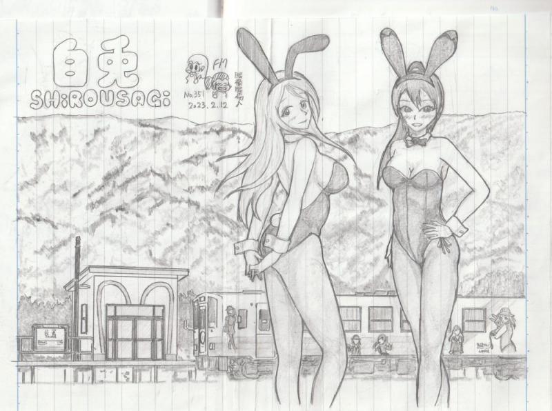 「2023年2月12日 神戸から来ました」とメッセージが残されていました。西山を背景にした白兎駅。今はなき鉄道娘列車がホームに入っています。鉛筆で描かれたのを見たのは初めてのような気がしますが、西山の峯々のタッチが素晴らしいと思います。 そしてFM眼福眼福さんもやっぱりバニーちゃんですね。富士には月見草が良く似合う。ローカル線には高校生が良く似合う。白兎駅にはバニーちゃんが良く似合う、ですかね。(笑)