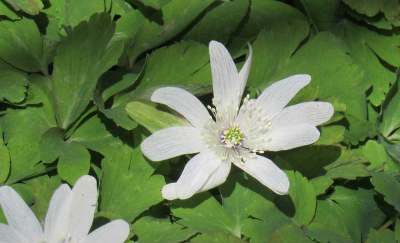 ●落葉樹の下に真っ白な花がたくさん咲いていました 調べてみると「アズマイチゲ」で、花期は3月から5月ごろと記されていました。花弁は数えてみると10枚あり、春先に花を咲かせ落葉樹の若葉が広がる頃には地上部は枯れてなくなり翌春まで地下茎で過ごす植物だそうです。別名「雨降花」とも呼ばれ、摘み取ると雨が降るという説もあるそうです。