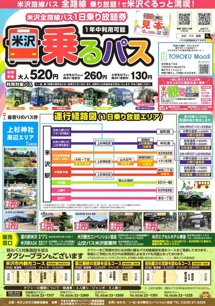 For the low, low price of 520 yen, get yourself the Yonezawa 1-Day Bus Pass and hop on the buses to explore Yonezawa to your heart’s content! Both the city buses and the Yamako buses are covered by this pass!If you prefer having an e-ticket instead, you can also purchase it via TOHOKU MaaS! Sale PeriodFrom 1st April 2024 (Monday), all year round PriceAdults - 520 yenAdults with disabilities or Children (Elementary school age and below) – 260 yenChildren with disabilities – 130 yen Where to Purchase-    When you board the bus-    Yamako Bus Yonezawa Office-    ASK (Yonezawa Station Tourist Information Center)-    Yonezawa Tourism & Convention Bureau Tourist Information Center (at Uesugi Shrine)-    Michi no Eki Yonezawa Tourist Information Center-    Yonezawa Excel Hotel Tokyu* The Yonezawa Sightseeing Passport will also be on sale concurrently. For more information, check this post out.Flyer PDF ContactYonezawa Tourism & Convention BureauTEL: 0238-21-6226 (Japanese)