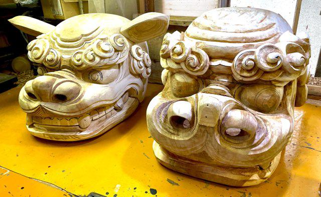 根元から総宮型獅子頭の頭部を7頭を荒彫りし、歌丸型2、畔藤熊野型2、西高玉昼2、西高玉夜1、