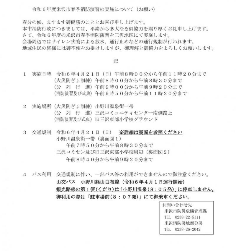 4/21(日)一部バス路線変更及び温泉街一時通行止めのお知らせ 令和6年4月21日(日)に小野川温泉街にて米沢市消防団春季演習が行われます。それに伴い温泉街発の山交バス一部路線変更と温泉街道路が一時通行止めになります。詳細につきましては、PDFをご覧ください。当日お越しのお客様にはご迷惑をおかけする場合がございますが、ご理解ご協力の程よろしくお願いいたします。 ◇実施日時 令和6年4月21日(日)8:00〜11:20まで (火災防ぎょ訓練) 8:00〜8:30 (分列行進) 9:00〜9:20 (消防演習及び式典) 9:50〜11:20 ◇実施場所 (火災防ぎょ訓練) 小野川温泉街一帯 (分列行進) 三沢コミュニティセンター南側路上 (消防演習及び式典) 旧三沢東部小学校グラウンド ◇交通規制 令和6年4月21日(日) 小野川温泉街一帯 7:50〜8:30まで 三沢コミュニティセンター及び旧三沢東部小学校周辺 8:40〜9:20まで ◇バス利用 交通規制に伴い、一部バス停の利用ができませんのでご注意ください。 【お問い合わせ】米沢市防災危機管理課 TEL:0238-22-5111 米沢消防署城西分署 TEL:0238-26-2042