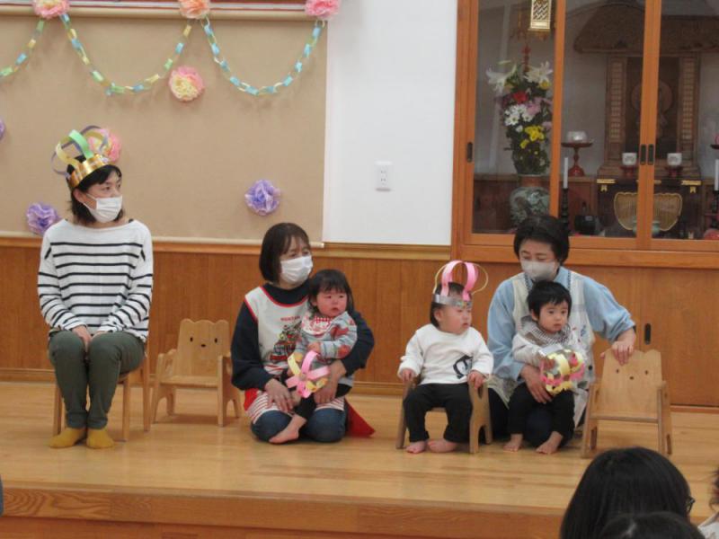 3月29日に、異所する友だちと退職・異動する先生とのさようならの会がありました。さくら組からのプレゼント「冠」をかぶっての入場。一人ひとりから名前、どこに行くか、一言をもらい、子どもたちはじっとお話を聞いていました。その後は各クラスからプレゼントをもらい、うめ組からは「花束」、もも組からは「チューリップの花束」、幼児組からは「絵を描いた手作りアルバム、ネックレス」を一人ひとり受け取り、嬉しそうな表情を見せていました。全員でありがとうの思いにのせて「ありがとうの花」を歌うと、涙する子どもたちの姿もあり、子どもたちの中で楽しかった思い出がよみがえっていたように感じられます。最後にはみんなで勇気100%を歌いながらアーチを作り、“ありがとう、がんばってね”の気持ちをこめて見送りました。