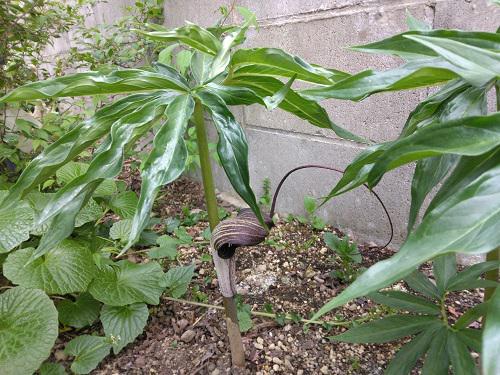 今日は、ちょっと不気味で奇妙な植物登場です! 去年は5/4にUPしていたので、今年はかなり早く開花です。 名前の由来などいろいろあるので、去年のブログを再度そのまま貼りつけますね。(スミマセン、、、) 2023/05/04ブログより。。。。 今日はちょっと不気味な植物登場です・・・花なのか分かりませんが、口の間から蛇の舌のような長いものが出て途中から垂れ下がって不気味デス!隠すかのように植えてあるのでうまく撮れません、、、 ↓(トップ写真) 突然にニョキニョキと・・・毎年知らないうちに陰の方に現れる変な植物、“ウラシマソウ”じーじが会社勤めをしていた頃に、同僚に頂いたものでした。この植物が現れると同僚の顔を思い出すようです。 名前の由来は・・・肉穂花序につく細長いひも状の付属物を浦島太郎の釣り糸に見立てたもの ↓恥ずかしいのか後ろ向きに・・・ブロック塀の所にそ〜と隠れているように見えます!残念ながら、正面からは撮れません・・・   今日4/26のおまけに・・・ひさしぶりの老犬サスケの登場です。ほとんど寝てばかりのサスケですが天気も良かったので生涯学習プラザの公園へ行って散歩してきました。今日はすごく元気そうに撮れています〜