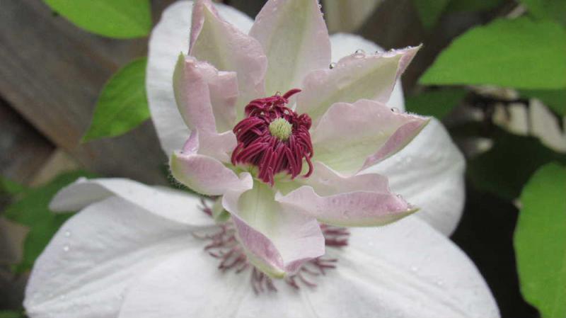 ●雨に濡れた庭の「クレマチス」が満開です 紫色と白の2色のクレマチスを植えたのですが紫色の花がうまく育たずに白のクレマチスが大きく華やかな姿で毎年しっかりと咲いて楽しませてくれています 実家の庭にも咲いていましたが「テッセン」と呼んでいました つる性の植物で1年間に3回ほど咲く四季咲きの花でイギリスではつる性植物の女王として位置づけられ親しまれているそうです