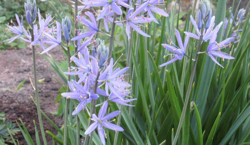 ●球根植物で春から初夏に咲く「カマシア」は6枚の花びらの星型の花を咲かせていました 茎を長く伸ばし1本の茎に多くの花をつけ初夏の季節にぴったりの爽やかな水色の花を咲かせています 青や紫 白などもあるそうでそんなに派手さはなく清楚な花で周りを引き立たせてくれる存在の花のようです 丈夫で場所がよければ放任していても年々増えるそうで 植えたいのですが我が家の庭には植える場所もありません