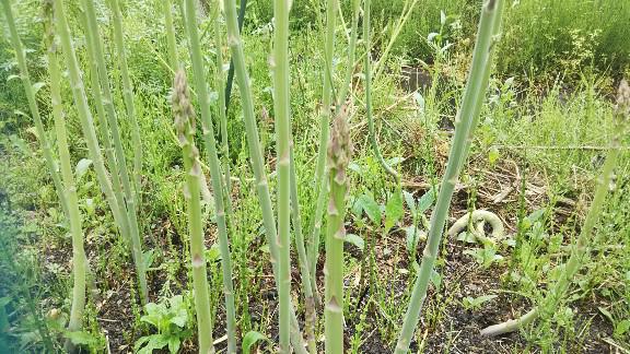 我が家のアスパラ、ほんの少しの場所ですが、6日間留守の間にぼうぼうと伸びすぎてし舞いましたね・・周りの雑草もすごいことに・・連休前は絵画展作品つくりで畑も庭も手付かずでしたので・・今日から畑仕事専念です・・アスパラ採って今日櫃はアスラらパスタですね