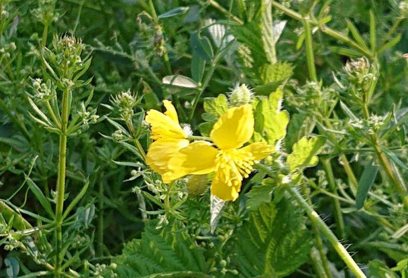 ●まだ田植えが行われていない田んぼのわきの水路に黄色の4枚の花びらをつけた「クサノオウ」が生えていました 葉や茎を傷つけると気褐色の液がでるので他の植物と区別できるそうです 名前も茎などを切ると黄色の汁が出るから「草の黄」薬草として優れているから「草の王」皮膚病に効くから「瘡の王」など諸説ありますが定説はないようです