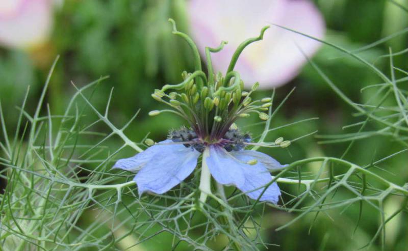 ●昨年知人からいただいた種を秋に蒔iいたものが芽を出した「ニゲラ」が青紫色の変わった花を咲かせてくれた 細い繊細な茎が伸びて枝分かれしその先に一輪さかせている 花は細かく裂けたような糸状の葉に覆われ、花びらに見えるガクを包み込むように咲いている 花びらのようなガクが散ると花がバルーン状にふくらみ角のような突起を出して形が楽しめるんだそうです 珍しい花ですでねえ