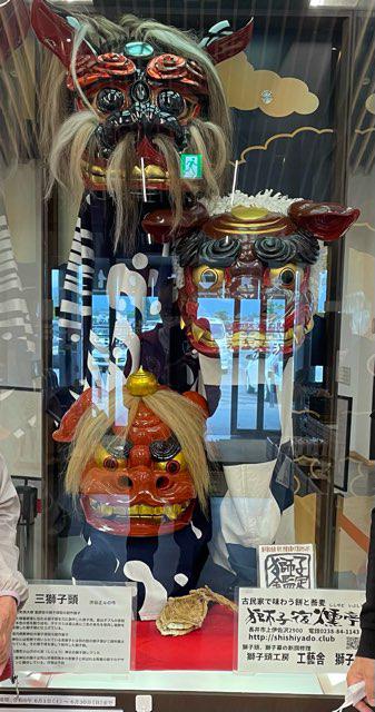 制作した獅子頭三頭とコレクションの古い獅子頭八頭で今回2回目の獅子頭展示になります。
