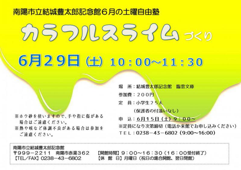 土曜自由塾は、6月〜12月の第4土曜日(変更あり)に行う小学生を対象とした講座です。つくるものは決まっていますが、その中で自分の好きなようにのびのびと楽しくつくります。 6月の土曜自由塾はカラフルスライムづくり6月29日(土)10:00〜11:30 に行います。参加費:200円申 込:6月15日(土)9:00から受付開始※定員(小学生25人)になり次第締切電話か来館でお申し込みください。TEL:0238−43−6802(9:00〜16:00) ※6/15 12:30頃に定員に達しましたのでお申し込み受け付けは終了いたしました。ありがとうございました。