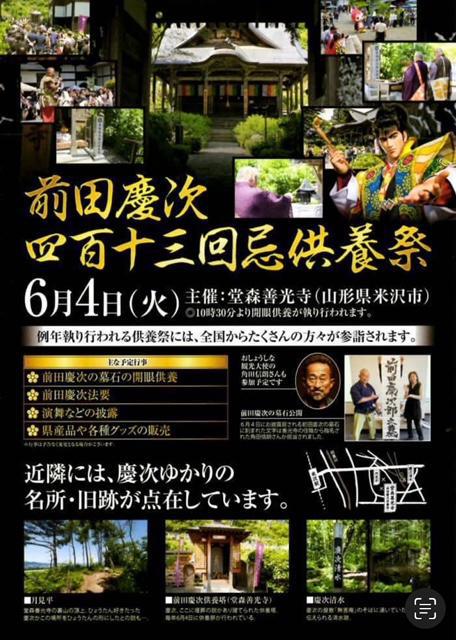 昨日は前田慶次四百十三回忌供養祭が行われました。「天下無双の傾奇者」と称された、戦国の武将・前田慶次は米沢で晩年を過ごしました。毎年6月4日は、慶次の命日としてご当地で厳かに供養祭が執り行われています。供養祭には、米沢市のおしょうしな観光大使の角田信朗さんも参加されました。一年に一度きりぜひ来年、参詣ください。 ◇場 所 堂森善光寺〒992-1126 山形県米沢市万世町堂森山下375TEL:0238-28-1638 ◇主な予定行事・前田慶次に墓石の開眼供養・前田慶次法要・演舞などの披露・県産品や各種グッズの販売 【お問い合わせ】堂森善光寺〒992-1126 山形県米沢市万世町堂森山下375TEL:0238-28-1638