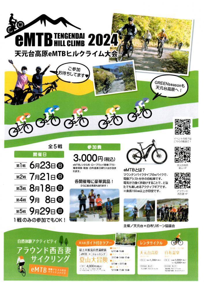 通常は通行できない、西吾妻資材運搬道路(冬季間は天元台高原・湯の平コース)を、電動アシスト付きマウンテンバイク「eMTB」で駆け上がる!普段、ロードバイクやマウンテンバイクに乗らない方でも、電気の力でグイグイ登るeMTBなら、どなたでもチャレンジできます!みなさんのご参加をお待ちしています!(1戦のみ参加もOK!)◇開催日(全5戦)第1戦 6月23日(日)第2戦 7月21日(日)第3戦 8月18日(日)第4戦 9月 8日(日)第5戦 9月29日(日)◇参加費 3,000円(税込)eMTBレンタル料・ロープウェイ乗車(下り)・傷害保険・軽食・白布温泉日帰り入浴が含まれます。◇定 員 9名※各開催毎に豪華賞品あり!5戦の合計ポイントで上位3位まで総合表彰!詳細はオフィシャルページをご覧ください。エントリーはコチラ◇お問い合わせ天元台×白布リボーン協議会 事務局 eMTB事業担当 TEL:0238-53-2761 メール:t.s.reborn.pj+mtb@gmail.com