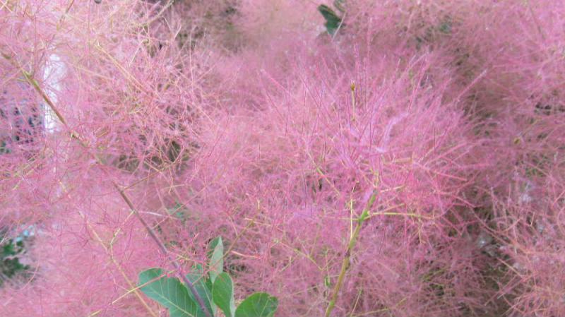 ●ピンクの煙が立ちのぼているように咲いている「スモークツリー」を散歩の途中で見つけました「ケムリノキ」という和名で呼ばれることもあるそうです 植えている方に聞いてみると「咲いている盛りには紫色の花でとてもきれいでした」とのことでした この「スモークツリー」は管理の手間がかからず初心者でも育てやすい花木だそうです 少し庭が広ければ植えてみたい花木の一つです