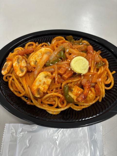 カフェランチココラ(0238-20-5424)のテイクアウト。ナポリタンです。お月様のような丸いものは粉チーズ。丸い型の容器に入っていたので、お月様のようにのってしまいました。崩せば良かったですね…。昔懐かしい、甘めのナポリタンで美味しかったです。