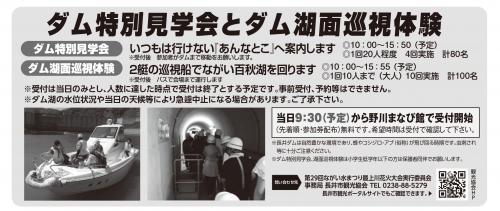 開催日令和6年8月3日(土)■□ ダム特別見学会 □■いつもは行けない『あんなところ』へ案内します!◎10:00〜15:30※受付後 各々ダムまで移動をお願いします。 ◆当日午前9:30から野川まなび館で受付開始 ◆(先着順・参加券配布) 無料です。 ◆希望時間は受付でご確認ください ■□ ダム湖面巡視体験 □■ダム湖面巡視体験は降雨状況等により中止となりました2艇の巡視船でながい百秋湖を回ります。◎10:00〜15:55 ※受付後、バスで会場まで運行します 《 注意事項 》・長井ダムは自然豊かな環境であり、蜂やホシジロ・アブ(俗称)が飛び回る時期です。虫刺され等には十分ご注意ください。・ダム特別見学会、湖面巡視体験は小学生低学年以下の方は保護者の同伴でお願いします。・当日の天候等により急遽中止になる場合がございます。ご了承ください。 ※最も重要な注意事項は下記になります ※受付は当日のみとし、人数に達した時点で受付は終了する予定です。 事前受付・予約等はできません。 参加券は、1人1枚の配布になります。(代理受取は禁止) 問い合わせ先長井市観光協会 TEL0238-88-5279