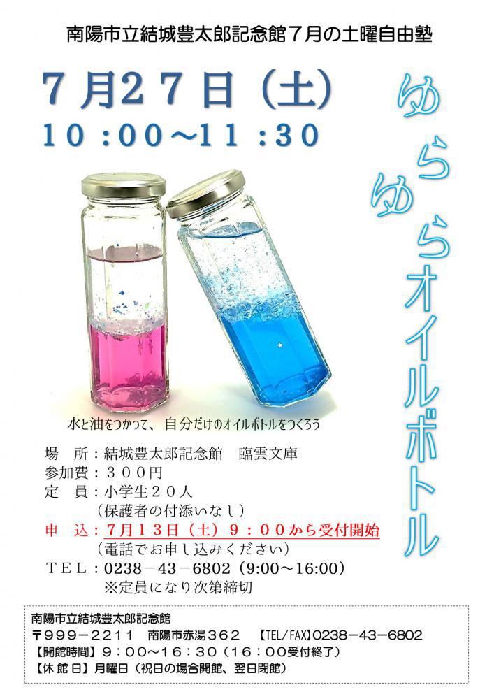 7月の土曜自由塾は ゆらゆらオイルボトル です。申 込:7月13日(土)9:00から受付開始※定員(小学生20人)になり次第締切電話でお申し込みください。TEL:0238−43−6802(9:00〜16:00)※7/13 14:30頃に定員に達しましたのでお申し込み受け付けは終了いたしました。ありがとうございました。--------------------6月29日(土)に行った「カラフルスライムづくり」無事に終了しました。ありがとうございます。赤、青、黄の絵の具を混ぜ合わせて、自分好みの色でのスライム作り。作った後は、自分がつくったスライムを混ぜ合わせてみたり、伸ばしたり、手形をとったりと時間いっぱいまで思い思いに遊びました。楽しんでもらえたでしょうか。※スライムを触った後は必ず手を洗ってくださいね。保存しておく場合はラップなどをして乾燥しないようにしてください。--------------------「土曜自由塾パスポート」を始めました。結城豊太郎先生のことを知っているかな?