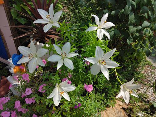 今日も、日が差したり雨が急に降ったりで・・・夜中も暑苦しく眠れませんでした…湿度も高くエアコン設定も悩んでしまいます。 (トップ写真)は。。。以前、飯豊町のユリ園に行ったときに頂いてきたゆりの球根ですが満開に咲いています。今も有料の最終日に頂けるようです・・・白のシンプルなユリですがなんか親しみ感じます。 梅雨といえば”紫陽花”ですが、我庭にもあちらこちらに・・・いいとこ撮りしてみました〜     6/29にUPした”ルドベキア アーバンサファリ”が開花!   今年のミニガーデンに植栽した新人花ですがようやく咲いてくれました〜♪“ガイラルディア・グレープセンセーション”   今年はどの植物も大きくなって通路を占領されています。      おまけに。。。絵に描いたような!バラ! ”モルゲンロート”