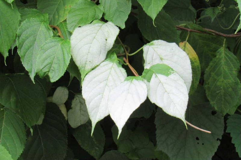 ●県道5号の吉野地区の下荻の道路沿いに葉が花のように白くなっている木を見つけました 花が咲く頃に葉が白くなる「マタタビ」であることがわかりました ネコが大好きな「マタタビ」でネコがこの木の匂いを嗅ぐと なめる かむ 顔や頭をこすり付けたり「マタタビ反応」を示すことがよく知られています 白い葉を初めて見ました