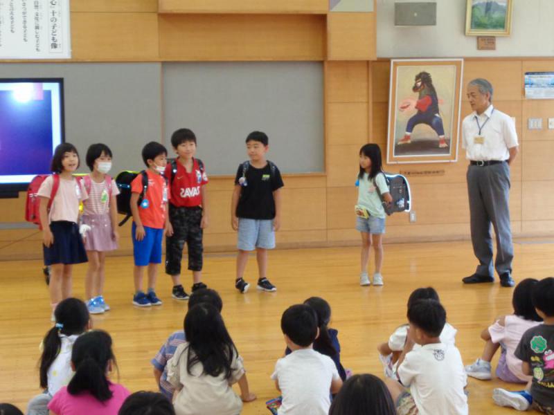 置賜教育事務所と長井警察署から講師をお招きしての不審者対応訓練です。2時間目に1〜3年生、3時間目に4〜6年生と、2回に分けて行いました。各学年2名の代表によるロールプレイングの様子です。「助けて〜!」と大きな声を出して逃げたことをとても誉めていただきました。なかなか声は出ないそうです。「きょうはいかのおすし」は、自分の命を守る合言葉。さらには、「さしみ」に「ちよこ」も。さて、覚えられたでしょうか。高学年でもロールプレイングを通して、不審者の対応方法を学びました。毎年の取組ですが、繰り返してやることが大事です。自分の命をしっかり守れる力を育てていきます。