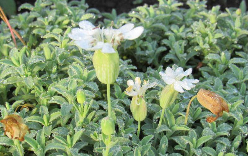 ●4月から6月が開花時期といわれているのでもう最後の花でしょうか「シレネユニフローラ」が咲いているのを見つけました そばには枯れた茶色の花が散らばっていました 草丈も低く釣鐘のような白い花でしたがピンクの花もあるのだそうですが 耐寒性で多年草で毎年春になると花を楽しむことができる草花です
