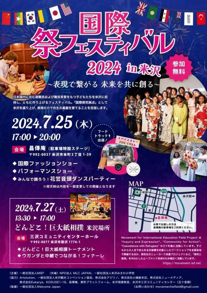 International Matsuri Festival 2024 in Yonezawa 〜 Connecting Through Expression, Creating the Future Together 〜We are pleased to announce the "International Matsuri Festival 2024 in Yonezawa," inviting children with refugee backgrounds and those living as evacuees in Japan to join us in creating a festival together. This event aims to establish Yonezawa as a hub for international exploration, fostering the foundation of coexistence through cultural exchange.Date and Time: Thursday, July 25, 2024, 17:00-20:00Venue: Special Stage in the Parking Lot of Shouden-an (992-0037, 3-1-39 Honcho, Yonezawa City)Admission: Free!Event Highlights: International Fashion Show Performance Show Let's Dance Together! Hanagasa Ondo Dance PartyNote: Some events may be subject to change in case of rain.Food trucks will also be available!This event is a wonderful opportunity to cherish cultural exchange and coexistence. Come and enjoy the International Matsuri Festival with everyone! Related events will also be held on different dates!Organizer: General Incorporated Association MIEFRelated Event:"Dondoko! Giant Paper Sumo Tournament in Yonezawa"Date and Time: Saturday, July 27, 2024, 13:30-17:00Venue: Misawa Community Center Hall (992-0077, 1776-1 Yanasawa, Yonezawa City)Event Highlights: Dondoko! Giant Paper Sumo Tournament Finale with Live Connection to Uganda