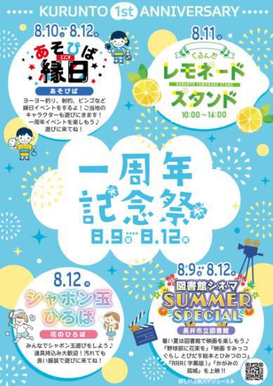 くるんと 一周年記念祭 開催!!開催日: 8月9日(金)〜8月12日(月) ☆イベント紹介☆8月9日(金)〜8月12日(月)図書館シネマ SUMMER SPECIAL 【長井市立図書館】暑い日は図書館で映画を楽しもう♪ 『野球部に花束を』『映画 すみっコぐらし とびだす絵本とひみつのコ』『RRR(字幕版)』『かがみの孤城』を上映!!※詳しい上映時間はくるんとホームページをご覧ください。 8月10日(土)〜8月12日(月)あそびば縁日 【あそびば】ヨーヨー釣り、射的、ビンゴなど縁日イベントをするよ!ご当地キャラクターも遊びにきます!一周年イベントを楽しもう♪遊びにきてね! 8月11日(日) 10:00~16:00くるんと レモネードスタンド [1杯 200円]長井市の特産品を使用した、つめた〜いレモネードで小児がんを支援しよう! 8月12日(月)シャボン玉ひろば 【花のひろば】みんなでシャボン玉遊びをしよう♪道具持込み大歓迎!汚れてもいい服装で遊びに来てね! 詳しくはくるんとホームページをご覧ください。