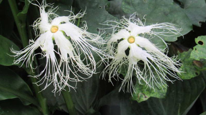 ●昨日の猛烈な雨がようやくおさまり 曇りの蒸し暑い一日のスタートです 道路の雑草の中に「カラスウリ」の花を見つけました レースのように白い糸が絡みついたようにきれいに咲いている「カラスウリ」は日没後に開花する花だそうです カラスが好んで食べるからとか熟した赤い実がカラスが食べ残したように見えるからとか命名の由来は諸説あるようです 秋に真っ赤に熟れた実をみてみたいものです