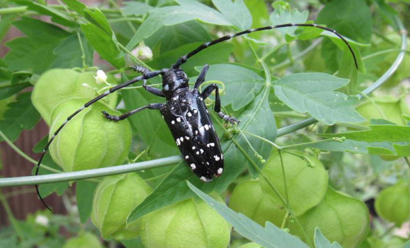 ●体全体が黒く光沢があり白い斑点のあるきれいなカマキリムシがフウセンカズラに止まっていました 我が家の庭では初めて見るカマキリムシです 正式には「ゴマダラカミキリ」という名前だそうですが体の模様から付いたといわれています 大あごが強くて髪の毛や細い枝なども切ることができるので「髪切虫」呼ばれるんだそうです 国内には900種以上確認されているとのことでどこにでもいる虫ですがあまり好きになれない虫の一つです