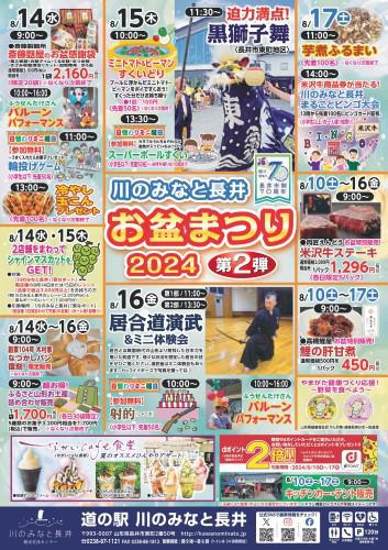 道の駅川のみなと長井 お盆まつり開催!!開催日:8月10日〜8月17日 ▼△▼△▼△▼ イベント紹介▼△▼△▼△▼ 8月10日〜8月16日 9:00~ 肉匠えんどうお盆特別販売! 米沢牛ステーキ●通常2000円相当を1パック1.296円(税込) ≪各日限定5パック≫8月10日〜8月17日 9:00~ 高橋鯉屋お盆特別販売! 鯉の肝甘煮●通常500円を1パック450円(税込) 8月14日 9:00~ 斎藤麩屋のお盆感謝袋 ●通常価格3.100円(税込)相当を1袋2.160円(税込) ≪限定20袋≫ なくなり次第終了※箱入板麩・お麩タイム・くるま麩・おつゆ麩・きざみ板麩薄切りカット・加賀棒茶 計6品10:00~16:00 ふうせんたけさん バルーンパフォーマンス11:00~ 日替わりミニ縁日 〜うまく入れたらお菓子プレゼント〜 輪投げゲーム(小学生以下・先着50名) ≪参加無料≫13:00〜 冷やし玉こんプレゼント ≪先着100名≫ なくなり次第終了 8月14日・8月15日 2店舗をまわってシャインマスカットをGET!※対象…「川のみなと長井」「菜なポート」両店舗の8月14日または15日のレシート【合算で税込3.000円以上】をお持ちの方(例) 川のみなと長井レシート[2000円分]と菜なポートのレシート[1000円分]※引換場所…「川のみなと長井」「菜なポート」≪各店舗 2日間合わせて先着20名様・お一人様一回限り≫8月14日〜8月16日 9:00~ 創業104年 木村家なつかしパン復刻!限定販売 ※なくなり次第終了9:00~ 超お得!ふるさと山形お土産詰め合わせ販売 1袋1.700円(税込) ≪各日30袋限定≫ ※なくなり次第終了 8月15日 10:00~ ミニトマト&ピーマンすくいどり ≪1回:100円/先着50名≫ なくなり次第終了11:30~ 迫力満点!黒獅子舞 〈長井市東町地区〉13:30~ 日替わりミニ縁日 スーパーボールすくい (小学生以下・先着50名) ※お持ち帰りは10個まで [参加無料] 8月16日 居合道演舞&ミニ体験会 《第一部 11:00~/第二部 13:30~》10:00~ 日替わりミニ縁日 射的 (小学生以下・先着50名)10:00~16:00 ふうせんたけさん バルーンパフォーマンス 8月17日 11:00~ 芋煮ふるまい 《先着100名》 なくなり次第終了14:00~ 米沢牛商品券が当たる!!川のみなと長井まるごとビンゴ大会※13:00から先着100名にビンゴカードを配布 《小学生以上・お一人様一回限り》