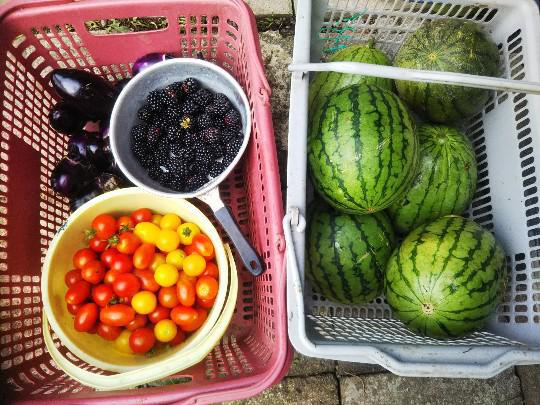我が家の家庭菜園、昨日の休み、いつもの草むしり、草刈り・・とにかく雑草はきりがない・・草むしりしての自家菜園の朝採りしました、ナス、ブラックベリー、トマト、スイカ、キュウリと採らないとそれはそれで大きくなりすぎや、腐れていくし、採ったらとったで消費もついていけない・・スイカは友人に配ります・・