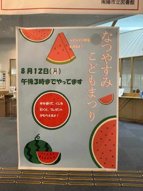 市立図書館では8月12日(月)に「夏休み こどもまつり」を開催します。本を借りて、くじをひくとプレゼントが貰えたりと楽しいイベントが沢山あります。午後3時までの開催です。 ※えくぼプラザ周辺でのイベント開催のため、図書館の閉館時間の変更があります。ご注意下さい。