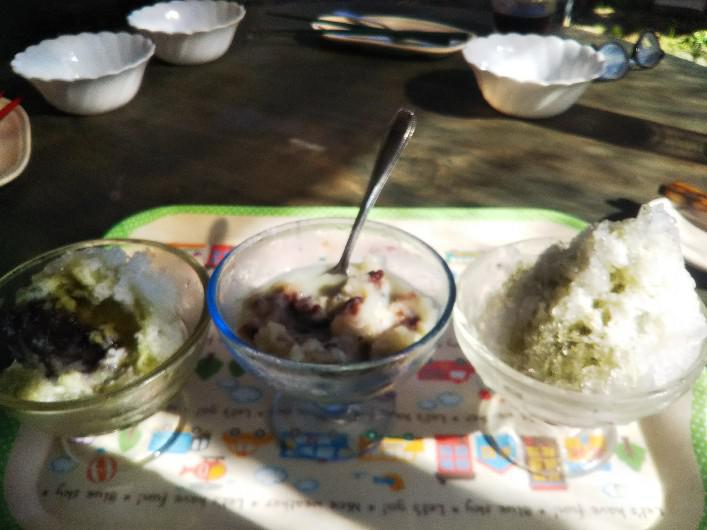今日は山友と我が家でバーベキュー予定してまして、あまりの暑さで、まずは、かき氷食べたいということでかき氷作りましたー、あずき氷に、練乳と抹茶かけてのかき氷すぐ溶けてくる暑さの中、涼しさは一瞬でおしまい