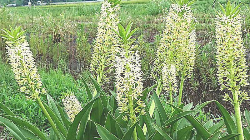 ●頭にちょこんと髪の毛をしばったような葉をつけてまさにパイナップルのような形をしている花を見つけました 昨年8月にもアップした時に「パイナップルリリー」と教えていただきましたがパイナップルのような形の花は花壇の中でも目立ちます 頭の葉の形からユーコミス(ギリシャ語できれいな髪飾りを意味しているそうです)の名前の花だそうですが どちらの名前もなるほどと納得してしまいます