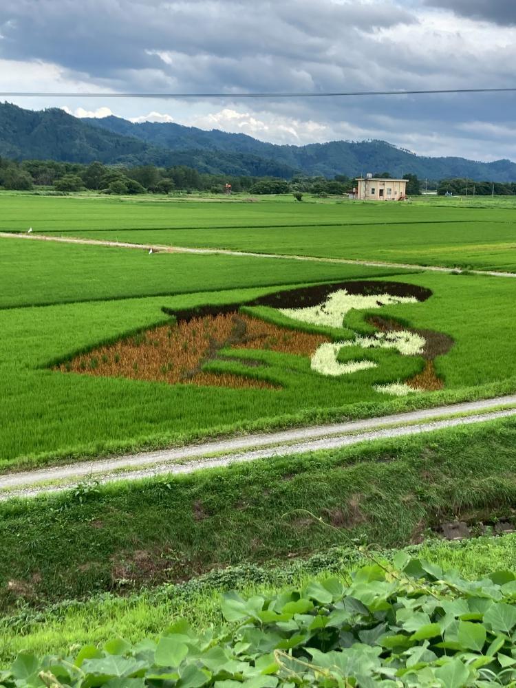 白鷹町「蚕桑駅前夢プロジェクト」さんの「田んぼアート」が見ごろを迎えています。蚕桑地区の名にちなみ、「お蚕の恩返し」をテーマに創作されてきました。今年の図柄は「おかいこ姫」の「繭美(まゆみ)」が結婚して、双子を授かり母乳を飲ませているという場面だそうです。この写真は夢プロジェクトさんから送っていただいたものです。 蚕桑駅前夢プロジェクトさんとは羽前成田駅の第2次改修事業を実施した2012年から交流させていただきました。今では写真データの送受信だけで情報共有ができます。これからはこんな形で、沿線の人たちとつながりながら、応援しあっていければと思います。 夢プロジェクトの皆さんとの交流はこちらから → 成田駅の卆寿と改修工事の竣工を祝う会 B:山形鉄道 おらだの会 (samidare.jp) → 成田駅の卆寿と改修工事の竣工を祝う会 C:山形鉄道 おらだの会 (samidare.jp)