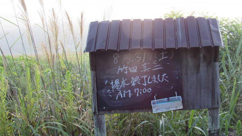 ●「揚水終了しました」 ススキの穂が揺れるそばの古い木造の看板に書いてあるチョークの文字です 稲穂が実りこうべを垂れて収穫ももうすぐの田んぼの黄金色のイネが輝いています 実り始めたイネにもう水はいりませんとのメッセージがなにげなく書き込まれた文字や収穫間近の稲穂から秋を感じた一コマです
