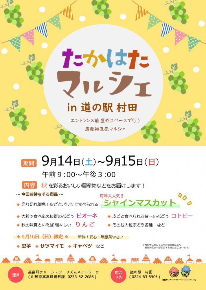 宮城県柴田郡村田町の「道の駅 村田」にて「たかはたマルシェin道の駅村田」を開催します!シャインマスカットやピオーネなどのぶどうや瑞々しいりんご、里いもやサツマイモなど秋を彩る高畠町のおいしい農産物などをお届けします。ぜひお越しください!◆日時 9月14日(土)〜9月15日(日) 午前9:00〜午後3:00◆場所 道の駅村田(〒989-1305 宮城県柴田郡村田町村田北塩内41) Googleマップ◆運営 高畠町グリーン・ツーリズムネットワーク(山形県高畠町農林課 0238-52-2086)◆お問い合わせ 道の駅 村田 0244-83-5505