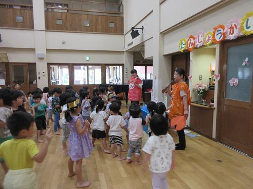 9月13日(金)に9月の誕生会がありました!子どもたちが得意なことをみんなの前で発表したり、お祝いの歌をプレゼントしたりと温かい誕生会になりました。年中、年長のお友だちはお家の方に得意なことを見せたい!とドキドキしながらも楽しみにしていました。最後は保育者の出し物でエビカニクスをみんなで踊りました!
