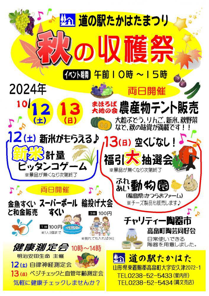 道の駅たかはたで今年も待ちに待った「秋の収穫祭」を開催します!大粒ぶどう、りんご、新米、秋野菜など、秋の味覚が満載です注目は、新米がもらえる「新米計量ピッタンコゲーム」と空くじなしの「福引大抽選会」!!お子さまに大人気の「ふれあい動物園」もやってきます!ぜひ秋の高畠町へ遊びに来てくださいね〜道の駅たかはたにはRVパークもございます。RVパーク詳細はこちらから◆日時 令和6年10月12日(土)・13日(日) 10時〜15時◆会場 道の駅たかはた 〒992-0302 山形県東置賜郡高畠町大字安久津2072−1 ◆お問い合わせ 道の駅たかはた 観光案内所 TEL:0238-52-5433 ホームページはこちらから
