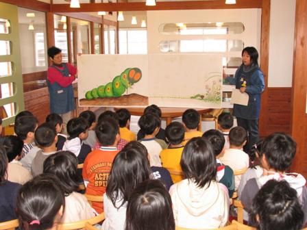 大型絵本や紙芝居など「ぽすと」の中で読み聞かせを行っています。